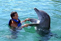 Now it’s time to meet your dolphin pal! Enter the water outfitted with a life vest and be introduced to a happy, playful dolphin. Touch the dolphin’s soft, smooth skin and listen as it sings. Your new pal will offer you a handshake, then pucker up for a gentle dolphin kiss! Head into deeper water and climb aboard a boogie board and let the dolphin push you through the water. Then, gently grab the dolphin’s pectoral fins for a cruising belly ride—it’s a ride you’ll never forget.