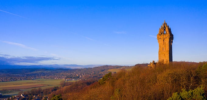 Depart from the pier and drive west following the Firth of Forth, as it narrows and becomes the winding River Forth. Just outside the city of Stirling, you will see the National Wallace Monument, a memorial built in 1869 in honor of William Wallace, the Scottish hero known as Braveheart. It sits atop Abbey Craig, a prominent hilltop where in 1297 Wallace led the Scots to victory against the encroaching English army.